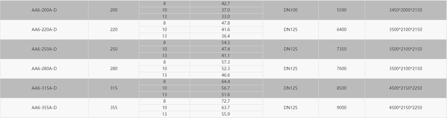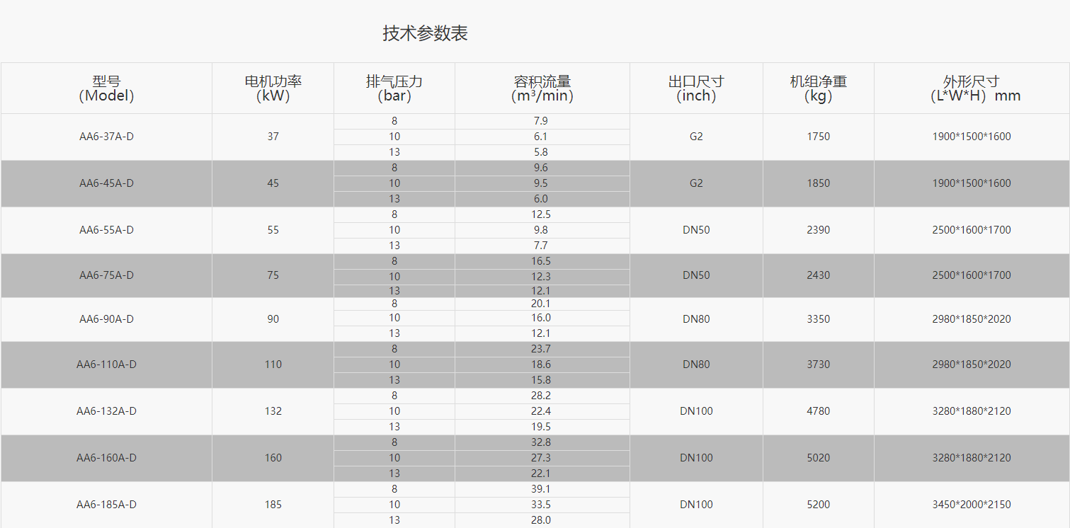 Hanbell D系列双段螺杆式空气压缩机: 双段工频压缩机组系列 双段永磁变频压缩机组系列 主要参数: 输出功率:37~355kW 风量:7.9~72.7m3/min 工作压力:0.8~1.3MPa